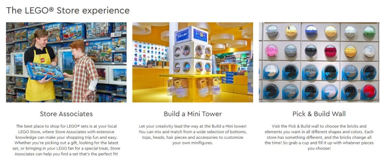 LEGO stores feature interactive displays that showcase assembled LEGO sets in 3D, which customers can rotate and explore digitally. This engages both children and adults in an immersive experience.